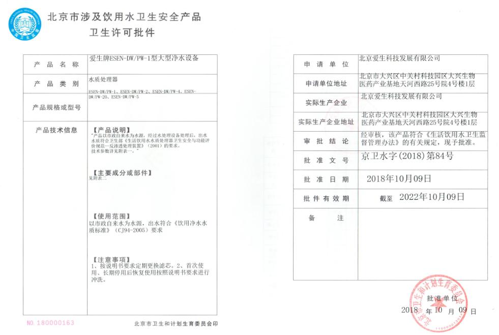 2018年8月底,愛生在長達十個月準(zhǔn)備的新一期衛(wèi)生批件申請,一次通過北京疾控中心組織的專家上會評審,產(chǎn)品及能力均獲專家首肯;2018年11月,經(jīng)北京市衛(wèi)生和計劃生育委員會批準(zhǔn),愛生拿到了第5張批件許可,成為北京地區(qū)為數(shù)不多的具備大型直飲水設(shè)備制造能力的專業(yè)企業(yè)。